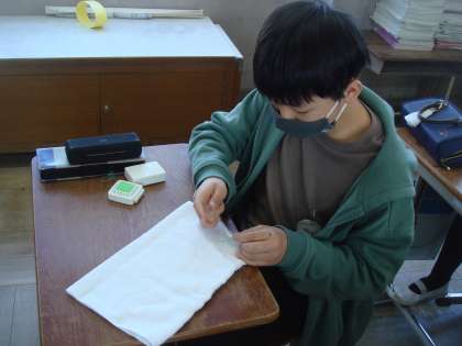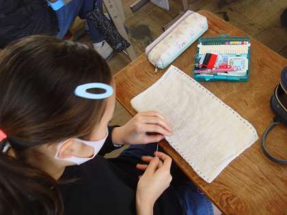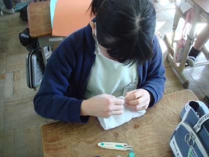 小学校生活も残りわずかになりました。家庭科の学習では、裁縫や調理ができるようになっただけでなく、地域の一員としていろいろな形で地域の方と関わっていること、これまで多くの方々に支えられて生活してきたことなどを学んできました。その感謝の気持ちを伝えるために、在校生にプレゼントを作っています。一目一目心をこめて制作中。出来上がったら、各クラスに届けに行きたいと思います。