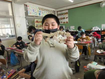 作品ができてとても喜ぶ子どもたち。きれいな色を塗った子もいました。釘でつなげているので、手や顔、しっぽなどが動く場所もありました。生き物の完成です。中には、釘を途中までうち、何かを掛けられるように仕上げた子もいました。