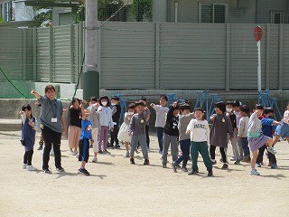 教室で頑張って学習を進めていた1年生。課題を終えて時間があまったので、今日は、運動場に出て、「もうじゅうがり」をしました。にこにこ元気いっぱいの1年生の姿でした。