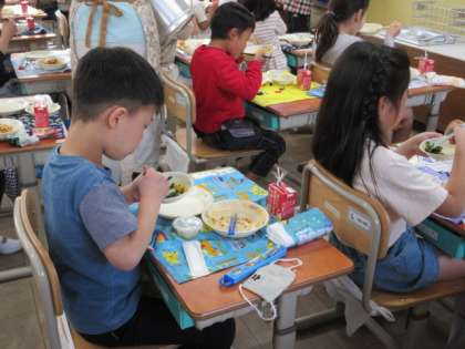 モリモリ食べる子どもたち。「すごくおいしい!」という声があちらこちらから聞こえてきました。何回も何回もお代わりをする子がたくさんいて、教室の食管はあっという間に空っぽになりました。楽しく食べられたようです。よかったです。