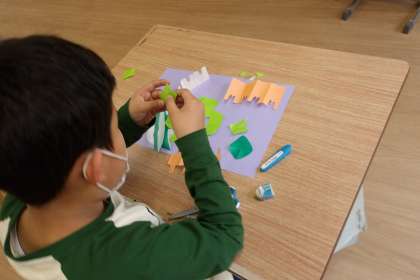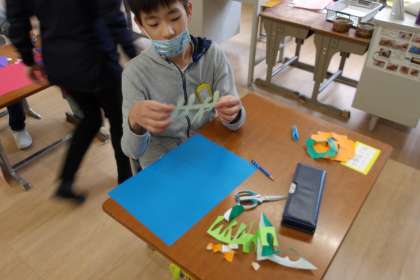 6くみは、今日の図工の時間にハサミと折り紙を使ってできる不思議な形づくりに挑戦しました。