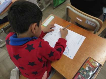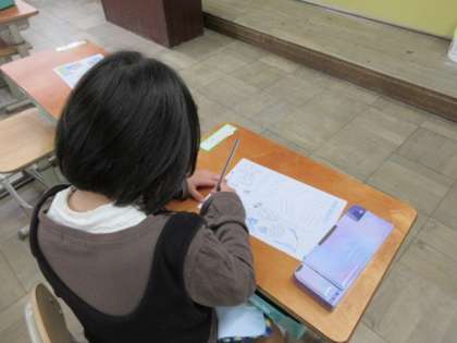 鉛筆の持ち方を確かめ、点線をなぞる活動をしました。まっすぐな線や曲線など、いろいろな線を鉛筆でかきました。文字を書く時の基本となる線の練習でした。みんな、集中して一生懸命頑張っていました。
