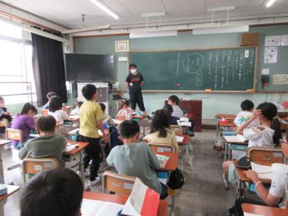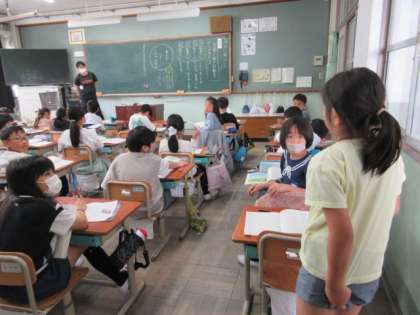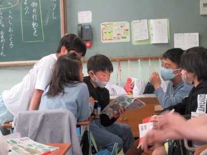 国語の学習で「白いぼうし」を読みました。人物の行動について読みました。読めば読むほど、分からないところが出てきました。「男の子は、たけのたけお なのか」グループで話し合うと、意見が二つに分かれました。「お母さんを連れてきたから、自分でちょうちょをつかまえて、見せたかった」「“いたんだもん”と言っているから、自分の帽子ではない。自分の帽子なら“つかまえたんだもん”っていうはずだ」など、文章中の言葉に着目して、考えを話し合いました。意見が出れば出るほど、謎は深まるばかり。熱心な話し合いが続きました。
