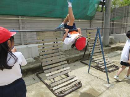 少し寒い連休明けでしたが、子どもたちは元気に準備運動をした後、一人一人のめあてに向かって鉄棒運動を楽しんでいました。