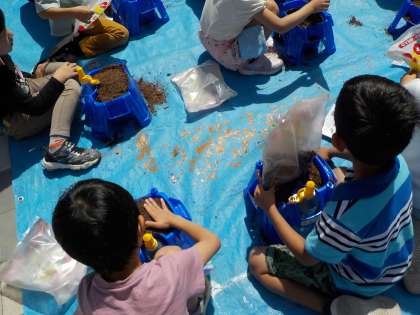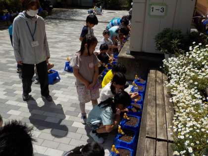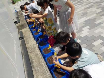 きのう朝顔の種の観察をした子どもたちは、今日の種まきを楽しみにしていました。「どんな色の花が咲くのかな」「大きくなってね」など、それぞれ願いをもって種をまいていました。明日から大切にお世話しようね。
