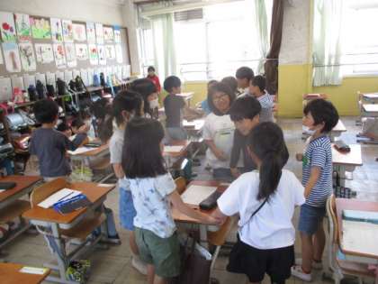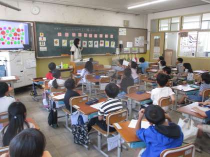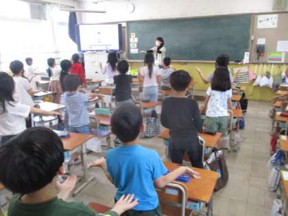 2年生になって初めての英語活動をしました。Hello Songを歌ったり、数の数え方を用いたゲームをしたりして、楽しく英語を学習しました。
