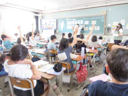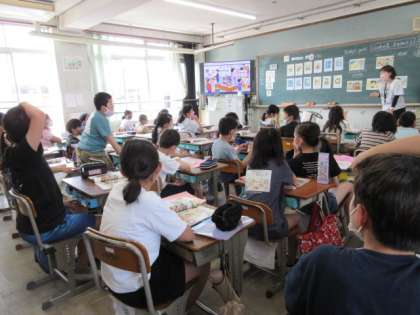 ALTの先生と発音を確かめながら、楽しく学習をしました。映画で話す動画のストーリーを一生懸命聞いていました。