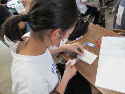インゲン豆を半分に割り、種の中を観察しました。小さな芽のような形のものを発見し「これが葉?」とつぶやく子がいました。