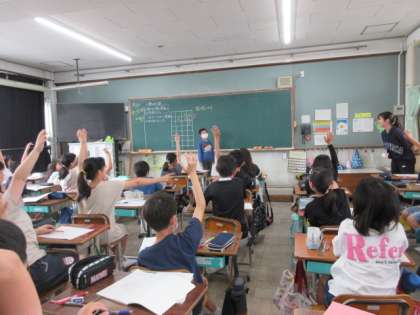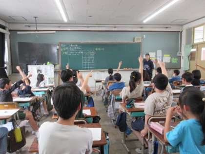 かけ算の計算の仕方を発表する子どもたちが、次々と前に出て説明をしていました。ただ説明をするだけでなく、聞いているお友だちに質問をしながら、みんなで課題解決をしていました。クラスみんなが手をあげて発表できるように、子どもたちみんなが考えて働きかけていました。あたたかい雰囲気の中、楽しく学習を進めることができました。