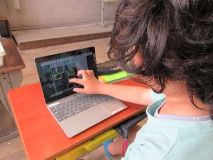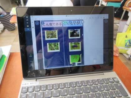 GIGA端末のノートのいくつかの写真を、こん虫かこん虫でないか、分けました。体のつくりや足の数に着目して写真をうごかして、表に写真を入れていきました。先生の写真があり、子どもたちは大喜びでした。「先生はこん虫じゃないな。」と言いながら操作しました。