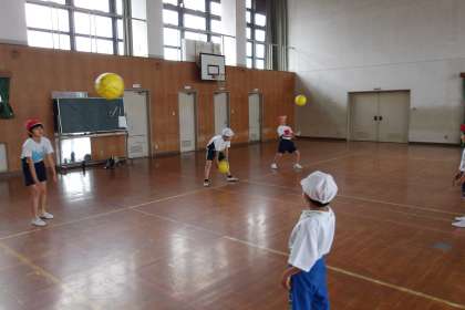 まずは、「目の前にいる人とキャッチボールをしよう。」というめあてでスタートし、次は、「ドッジボールをしよう。」へ。