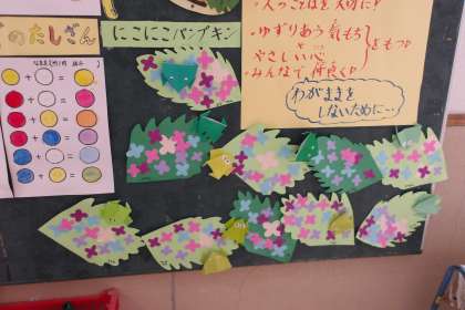 6くみは今日の図画工作科の時間に工作のりの使い方をみんなで確認しました。そして、確認したことを活かして画用紙でアジサイを作りました。
