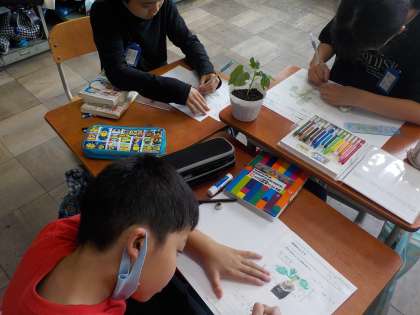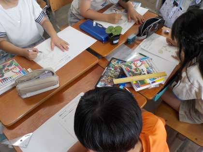 理科の学習でツルレイシの観察をしました。においをかいでみて「苦いにおいがする!」と反応していたり、葉の表面がざらざらしていることに気づいたりと、様々な発見ができていました。
