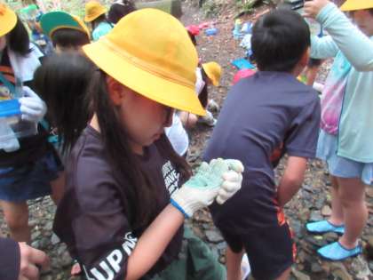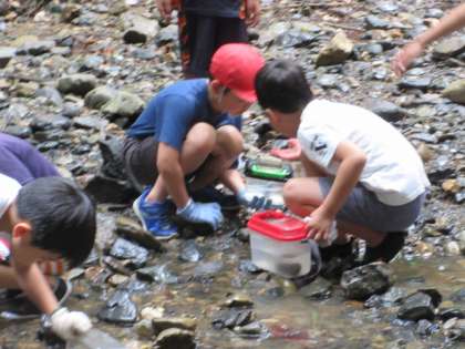 川のどこに生き物がいるのか、だんだんわかってきた子が増えてきました。一人が見つけると、「どこ?どこ?」とばかりにその場所へ子どもたちが集まります。