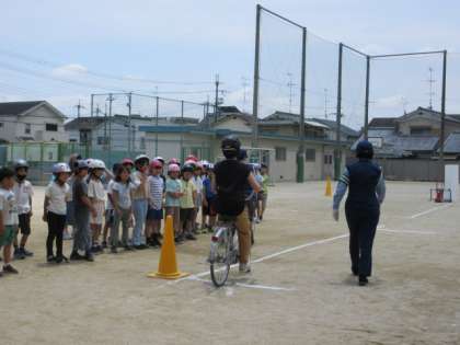 先生のお手本を見るとき、子どもたちはわくわくどきどき。「先生乗れるの?」と聞く子もいました。完璧なお手本にじっくりと見入る子どもたち。どこで安全確認をするのか、確かめることができました。