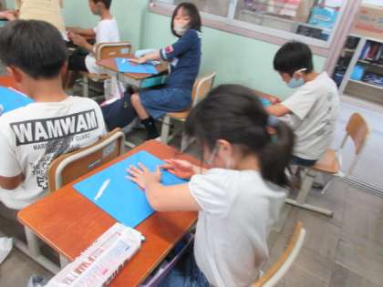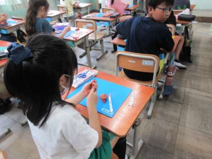 自分のイメージをもちながら、粘土に触れながら、表したいことを考えてつくりました。粘土を転がしたり丸めたりたたいたり、ねん土の感触を大いに楽しんだようでした。