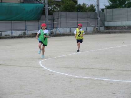 グループでバトンパスをがんばりました。一人一人力いっぱい走りました。グループで何秒でゴールをしたのかタイムを計りながら活動しました。