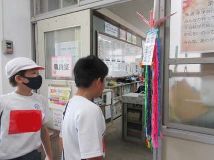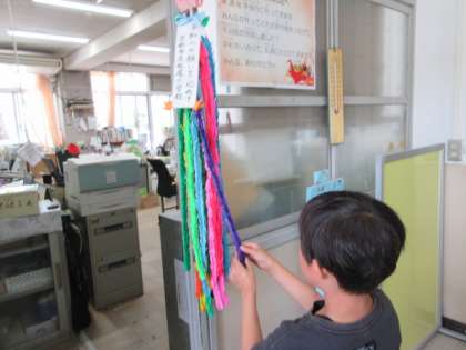 6年生は、修学旅行に千羽鶴を持っていきます。にこにこタイムで、松尾小学校みんなでつくりました。修学旅行に持っていく前に、職員室の前にかざりました。