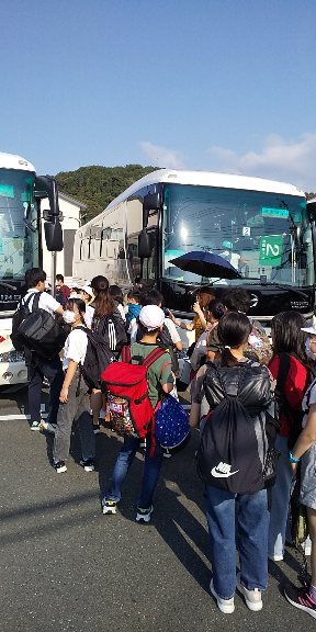 今日から二日間の日程で修学旅行に行きます。バスにのるところです。