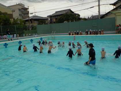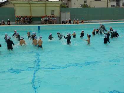 今日から水が少し深くなりました。水のかけあいっこやジャンプをしたりしました。プールの真ん中で水をかけあう活動では楽しそうな声が上がっていました。