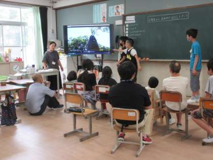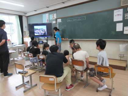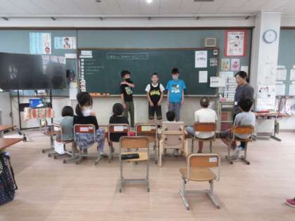 6年生が修学旅行の思い出を教えてくれました。修学旅行で行ったところや体験したことを、写真を開設しながらお話しました。1〜5年生は、質問をしたり感想を話したりしました。楽しいひとときでした。