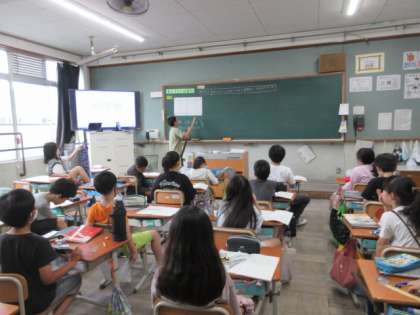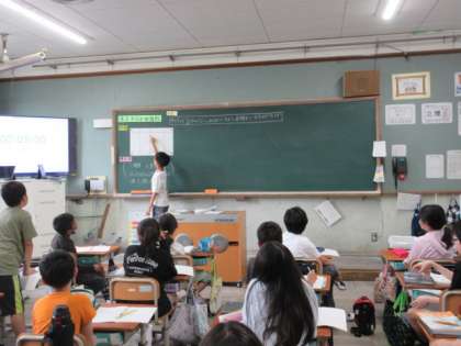 平行について「のばしても交わらない」という性質の他に、「平行はどのような直線だといえるのか」について考えました。考えがみんなに広がるように、答えをすぐに言わず、ゼスチャーでヒントを発表しました。みんな一生懸命考えました。