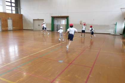 お互いに確認し合いながら、キャッチボールをしました。その後は、学んだことを活かしてドッジボール!!