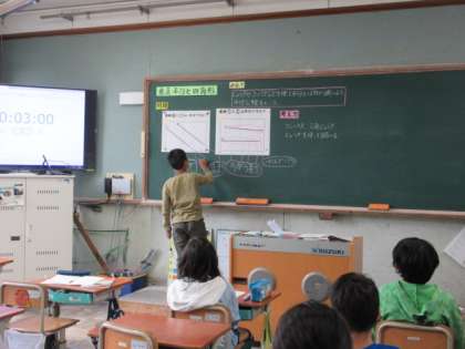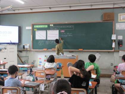 平行は、どのような直線なのか、考えました。「斜めの線はどうなのか」という疑問を基に、斜めになっている平行の直線と、微妙に平行ではない直線とを比べて考えました。みんなで、考えを板書しながら交流しました。