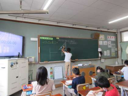 三角定規をつかって、平行な線や垂直な線をかく学習をしました。どのようにしてかくのか、一人で考えたり、みんなで教え合ったりして、しっかりかくことができました。積極的に黒板にかいて発表しました。