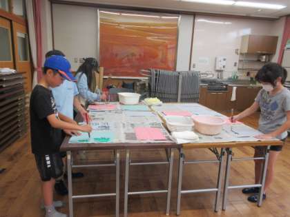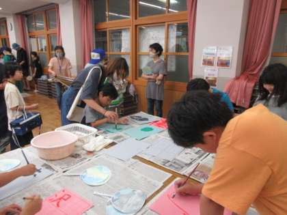 「おみずのおしゅうじ」のコーナーでは、筆に水をつけて、思い思いに文字を書くことができました。好きな文字や自分の名前などを書いていました。習字をしたことがない小さな子も、楽しく書いていました。かいたものは、乾くと消えるので、何度でも書けました。