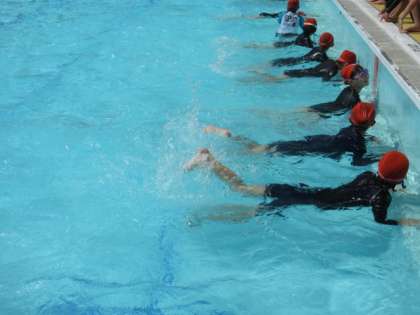 とても暑かった5・6時間目。3年生はプールで水泳の学習をしました。バタ足や水慣れで、元気に活動しました。水慣れでは、25mを縦に移動しながら、ロケットやイルカ泳ぎ、ふし浮きなどをしました。