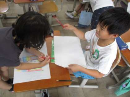 国語の時間では、『あったらいいな こんなもの』の学習をしています。今日は、自分の考えた“あったらいいな”を友だちに紹介しました。「なんでそれがあったらいいなと思ったの?」や「どんなことができるの?」など、友だちに質問しながら聞いたり、「それおもしろい!」「めっちゃいいなあ!」など、感想を返しながら聞いたりすることができました。