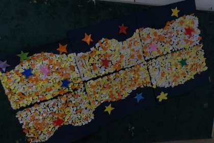 そこで6くみでは先日から色画用紙を切って貼って、天の川を作り始め、ついに今日完成ました!!