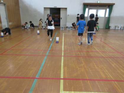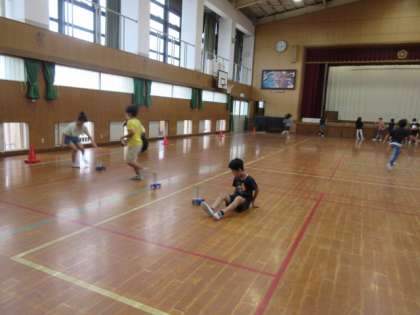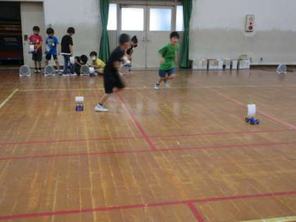 強い風で遠くへ動く車に、子どもたちも大喜びでした。そして、しっかりノートに記録することができました。車と一緒に歩いたり走ったりして、楽しく活動しました。今日は、涼しい日で、体育館に入ってくる自然の風が、一番強く、車はとても遠くへ動きました。