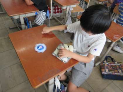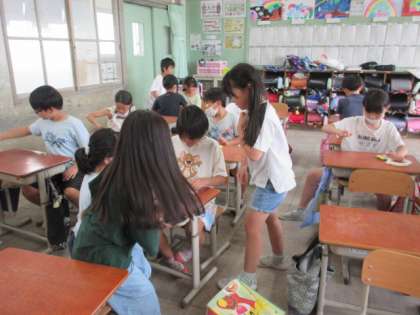 最後に、松寿会の方々からプレゼントをもらいました。プレゼントは、1日の最後に開けました。折り紙で作ったきれいなコマでした。子どもたちは大喜びでした。