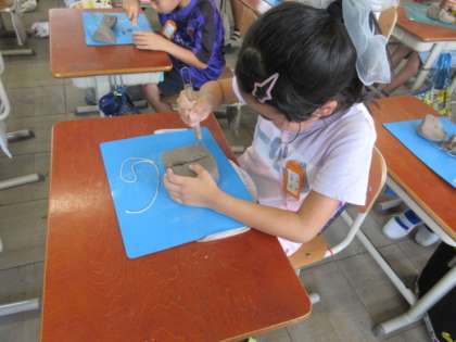 図画工作の学習では、「切り糸」や「かきべら」を使って、粘土を切ったりけずったり、くっつけたりしてできる形をもとに、自分のイメージをもちながら表したいことを見付けたり、表したいことを考えたりしてつくるようにしました。子どもたちは、切った後の面をみて驚いたり喜んだりしました。そして、どんどん想像を膨らませて活動しました。