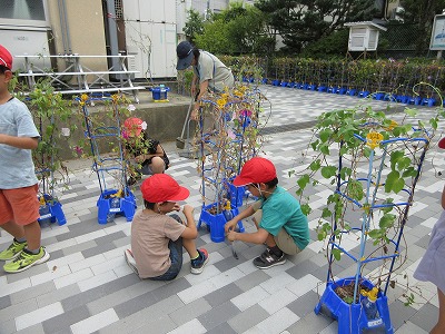 アサガオの花がまだ頑張って咲いている植木鉢もたくさんあります。1年生の子どもたちは、次々とできる種を取るようにしています。勝手にはじけてなくなってしまっているところもありました。たくさんの種を集めて子どもたちはうれしそうでした。