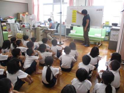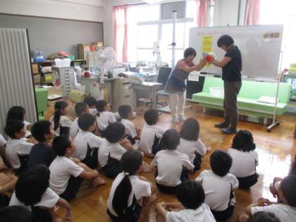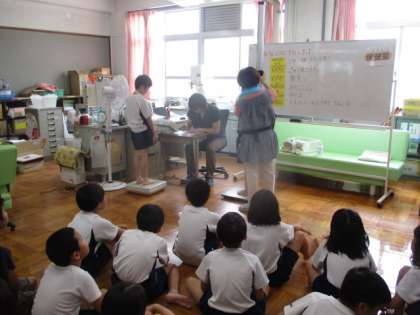 身体計測がありました。計測の前には、保健室に来た時に先生に伝えることを、人形劇を通して学習しました。