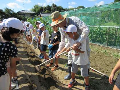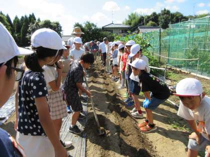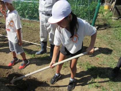いよいよ種植え。鍬でみぞをほりました。初めて体験する子も多く、貴重な体験でした。