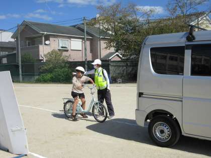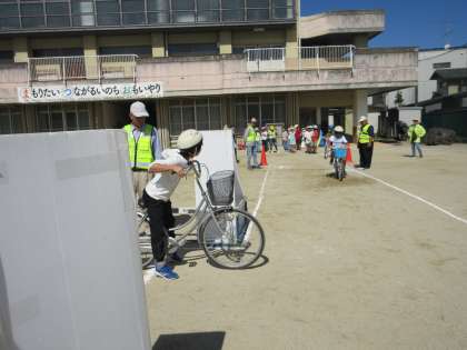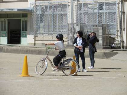 道路に車が止まっていたら、見通しの悪いところを通るときには・・など、実際の道路で出会う状況が運動場で再現されていました。そこを自転車で走るので、大切な体験となりました。