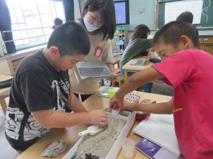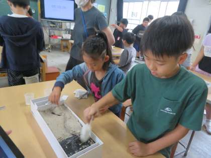 理科の学習では、流れる水のはたらきについて学習しています。模型を使って、水が流れるとどのようになるのかを調べました。水の量やコースを変えて、実験を進めました。