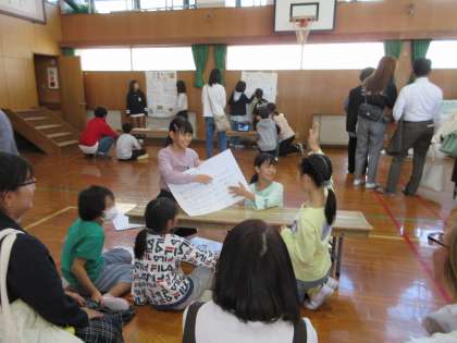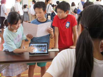 4年生は、京都の魅力について調べたことを、それぞれの方法で伝えました。模造紙にまとめたものをもとにして話したり、ロイロノートを使ったり、動画を使ったり、写真を見せながら話したり、自分に合った方法を使って発表しました。
