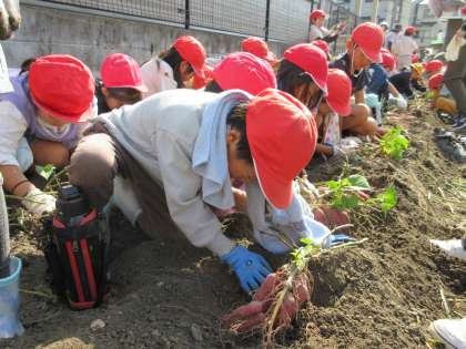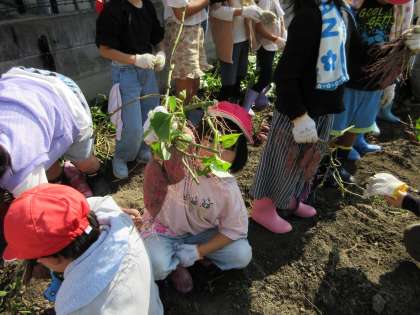 土を掘るのが大変でしたが、子どもたちはとてもうれしそうでした。中には「いもほり名人」がでてきて、なかなか掘れない友だちをどんどん手伝う子もでてきました。