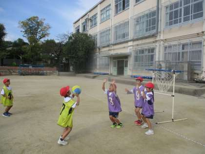 体育の学習で、パスゲームが始まりました。チームで声を掛け合って、元気にコートを走り回っています。得点が入ったときは、試合に出ていない人も大喜び!駆け寄ってハイタッチする姿も見られています。