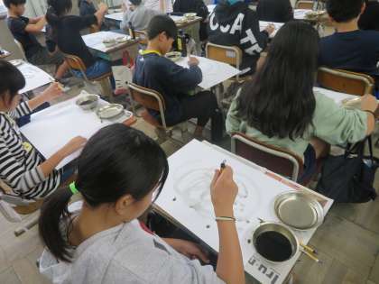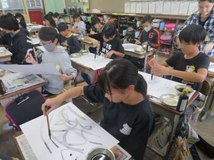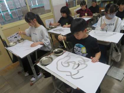 「社会の学習で登場した雪舟のように水墨画を描いてみよう」と水に墨液を入れて思いっきり線を描くことを楽しみました。最後に作品名を考え,個性豊かな素敵な作品が出来上がりました。