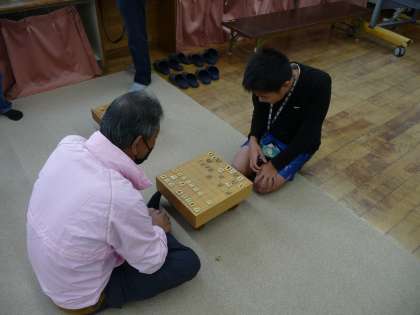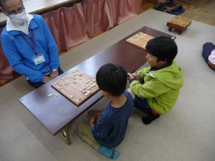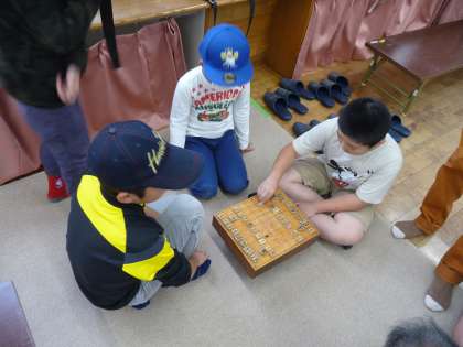 将棋では、なかなかルールが難しい中でもみんなで教え合う姿や、地域の方に一緒になって考えて戦う姿、また子どもたち同士で対戦している姿が見られました。