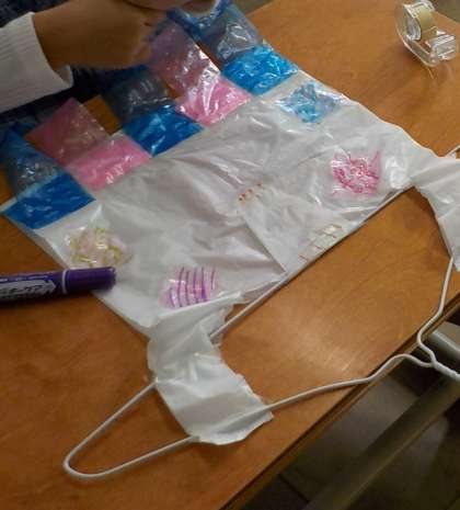 図画工作で「ひらひらゆれて」の作品を作りました。ビニール袋に紙テープやすずらんテープをつけて思い思いに作品作りをしました。