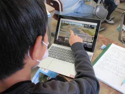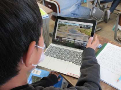 川辺の土地の形が違うことに気が付いた子が、GIGA端末の機能を使って線を描き、変化がよくわかるようにまとめていました。