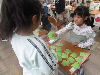 英語の学習で、野菜の英語での言い方を学習しました。そして覚えた野菜や、やりとりの言い方を用いて、お店屋さんをしました。