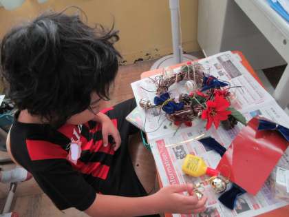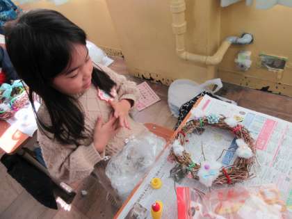 アサガオのつるにかざりをつけて、リースをつくりました。一人一人、楽しくつくりました。どのリースもとても素敵でした。